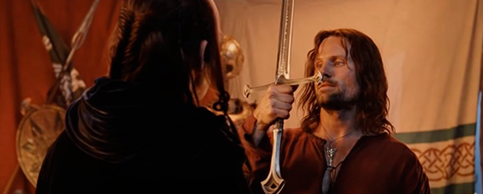 Aunque en los libros ocurre mucho antes y el progreso de Aragorn como personaje es menor, es en esta película donde recibe de las manos de Elrond a Andúril, la llama del oeste, la espada reforjada a partir de los fragmentos de Nársil. El elfo quiere que Aragorn sobreviva para su hija y éste es su regalo para la batalla. La espada en sí no tiene ningún efecto mágico como tal, pero sí que tiene un gran efecto simbólico que servirá en la dungeon en que Aragorn está a punto de meterse para reclamar la ayuda del Rey de los muertos y sus huestes.